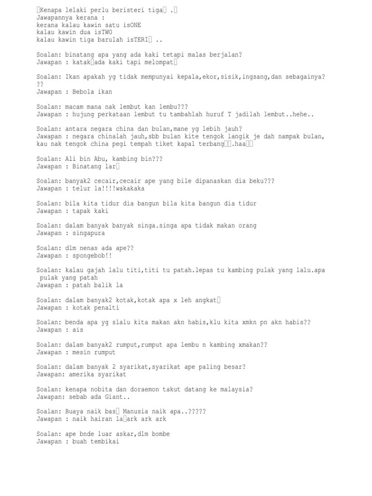 (= =)'' amim nie takde ke soalan mencabar jiawa raga sket. Tanya benda apa yang ada dalam nenas, aku telah diperkecilkan oleh seorang budak darjah dua . Banyak² kereta, kerata apa yang pemandunyer memandu dari belakang? Jawapan jazakallahu khairan nanikalux dalam nenas ada apa jawapan teka teki. Haiwan apakah yang ejaannya mempunyai dua huruf sahaja? Tidak kira apa tujuan kamu semua . Zirafah kerana masih ada di dalam peti ais. Banyak² kuih, kuih apa yang bukan kuih? Contoh teka teki logika tentang makanan. Kisah perbualan juga segmen teka teki.